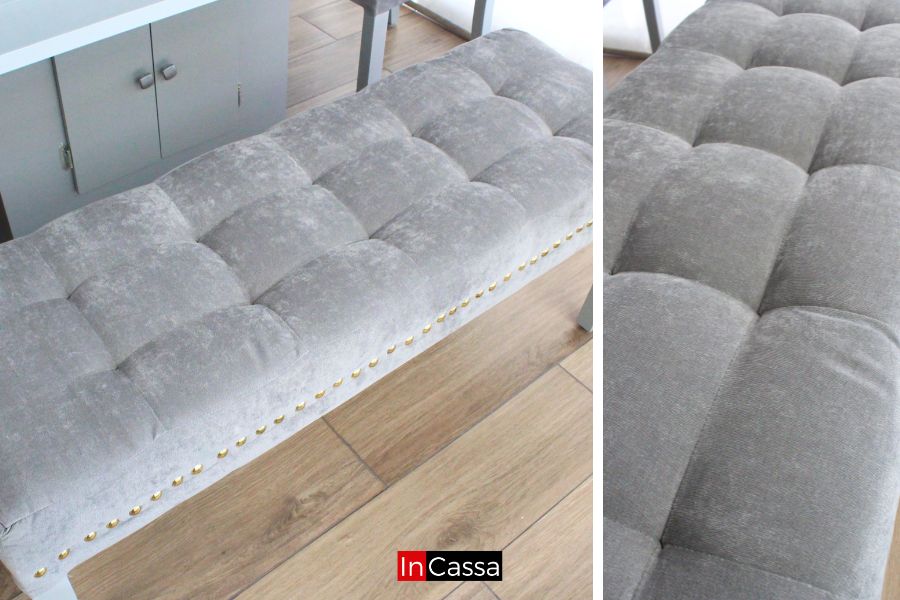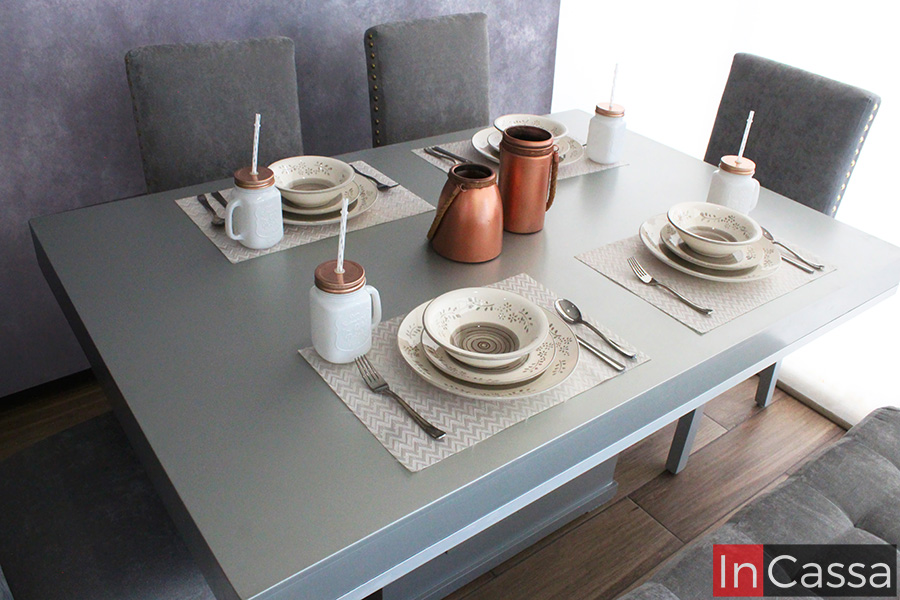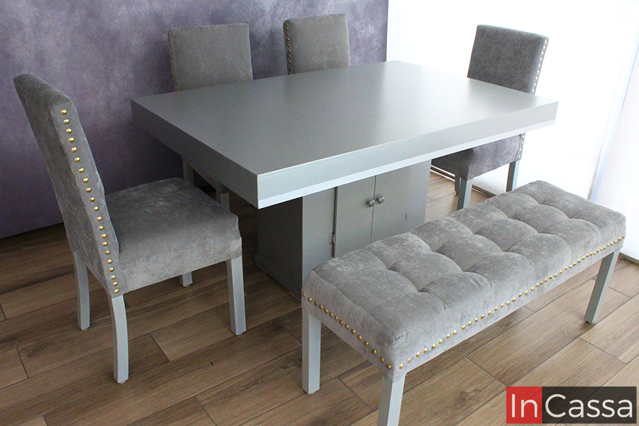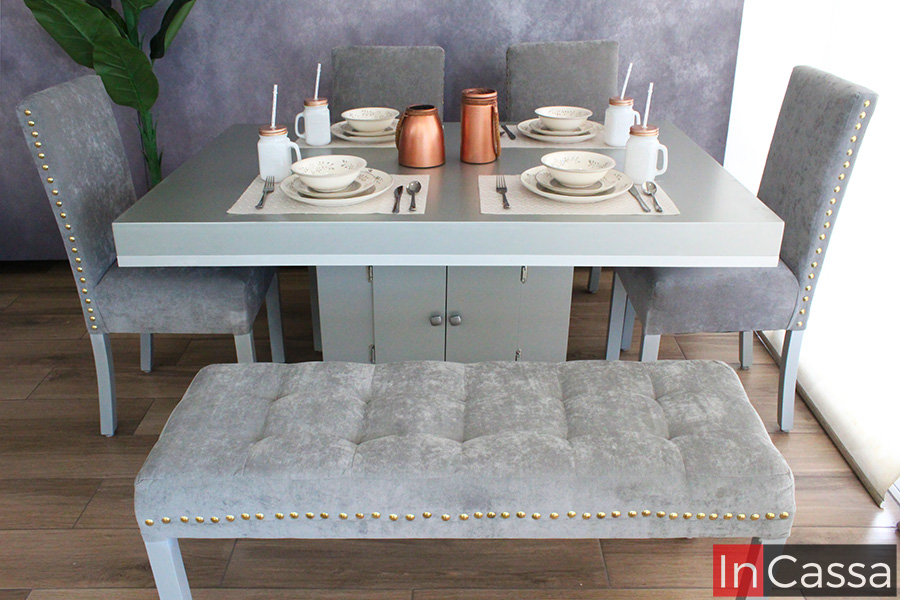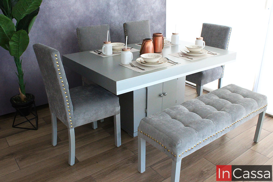 Comedores con diseños modernos y exclusivos. Contamos con 44 diseños a elegir; entre ellos modelos con banca, con luz, mesa de cristal, tapizados, mesa con arenero, etc. Somos fabricantes. Diseñados para 4 personas, comedores para 6 personas y comedores para 8 personas. Puedes elegir entre 40 opciones de pintura para la mesa y patas de silla y 86 telas para las sillas. Puedes crear la combinación perfecta. Tú eliges los colores. Cualquier modelo es fabricado en MDF chileno con sillas en Madera de Pino. Los pedestales tienen espacio para almacenar. Elige entre 55 modelos de comedor. Comedor con banca 6 personas Modelo PÁTZCUARO