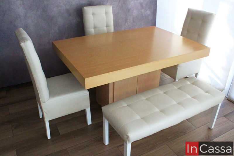 Comedores con diseños modernos y exclusivos. Contamos con 44 diseños a elegir; entre ellos modelos con banca, con luz, mesa de cristal, tapizados, mesa con arenero, etc. Somos fabricantes. Diseñados para 4 personas, comedores para 6 personas y comedores para 8 personas. Puedes elegir entre 40 opciones de pintura para la mesa y patas de silla y 86 telas para las sillas. Puedes crear la combinación perfecta. Tú eliges los colores. Cualquier modelo es fabricado en MDF chileno con sillas en Madera de Pino. Los pedestales tienen espacio para almacenar. Elige entre 55 modelos de comedor. Comedor de Exhibición 5 personas Modelo BALLETO