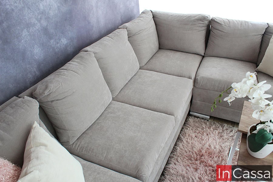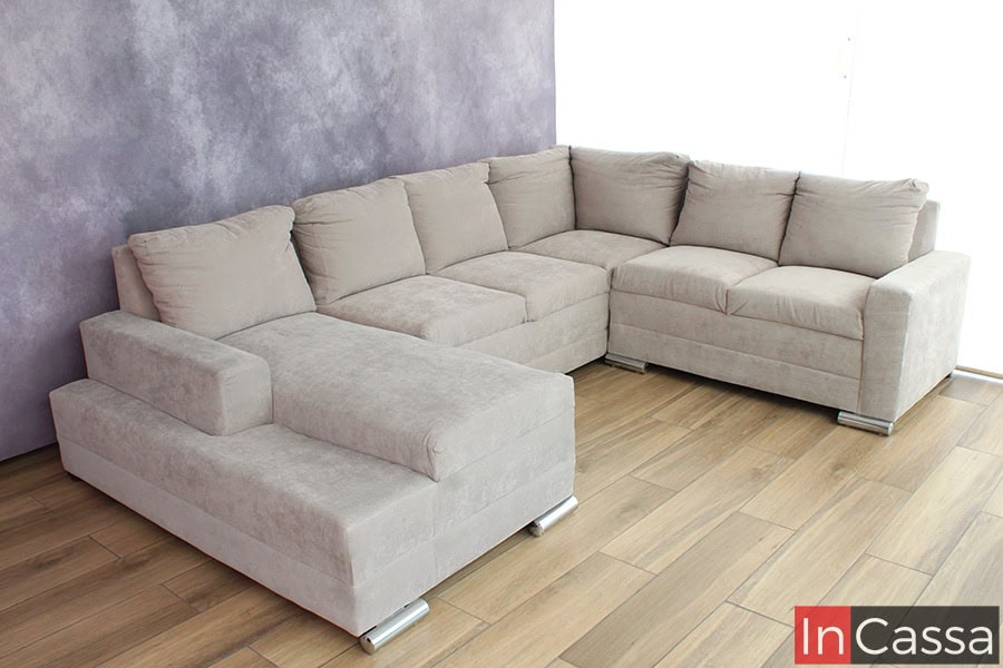 Contamos con 4 opciones de telas: Suede, lino, tactopiel y pliana. Tenemos un muestrario con 86 colores a elegir en telas. Fabricamos salas chicas, medianas y grandes, modalidad en escuadra o modulares. Estructura fabricada en madera de pino, resortes metálicos y espumas de poliuretano. Nuestros acojinamientos tienen un buen relleno y como resultado dan sofás suaves y cómodos. Tapizados estilo capitaneado o capitoné. En su exterior la estructura de los modelos son contemporáneos y como patas, usamos las metálicas para dar ese toque moderno y minimalista a nuestros muebles. Es decir, ofrecemos salas para todos los estilos, tamaños, gustos y bolsillos. Sala Modular en U Modelo ESPITA