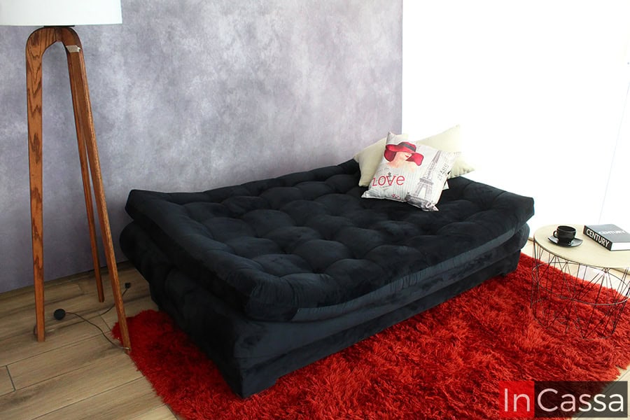 Contamos con 4 opciones de telas: Suede, lino, tactopiel y pliana. Tenemos un muestrario con 86 colores a elegir en telas. Fabricamos salas chicas, medianas y grandes, modalidad en escuadra o modulares. Estructura fabricada en madera de pino, resortes metálicos y espumas de poliuretano. Nuestros acojinamientos tienen un buen relleno y como resultado dan sofás suaves y cómodos. Tapizados estilo capitaneado o capitoné. En su exterior la estructura de los modelos son contemporáneos y como patas, usamos las metálicas para dar ese toque moderno y minimalista a nuestros muebles. Es decir, ofrecemos salas para todos los estilos, tamaños, gustos y bolsillos. Sofá Cama - Futon 3 posiciones Modelo APODACA