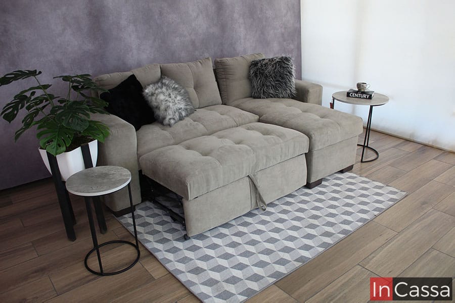 Contamos con 4 opciones de telas: Suede, lino, tactopiel y pliana. Tenemos un muestrario con 86 colores a elegir en telas. Fabricamos salas chicas, medianas y grandes, modalidad en escuadra o modulares. Estructura fabricada en madera de pino, resortes metálicos y espumas de poliuretano. Nuestros acojinamientos tienen un buen relleno y como resultado dan sofás suaves y cómodos. Tapizados estilo capitaneado o capitoné. En su exterior la estructura de los modelos son contemporáneos y como patas, usamos las metálicas para dar ese toque moderno y minimalista a nuestros muebles. Es decir, ofrecemos salas para todos los estilos, tamaños, gustos y bolsillos. Sofa cama suede gris Modelo HUICHAPAN