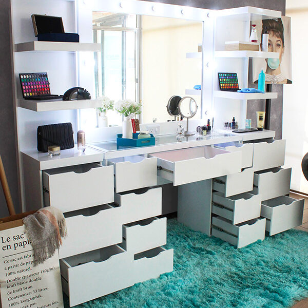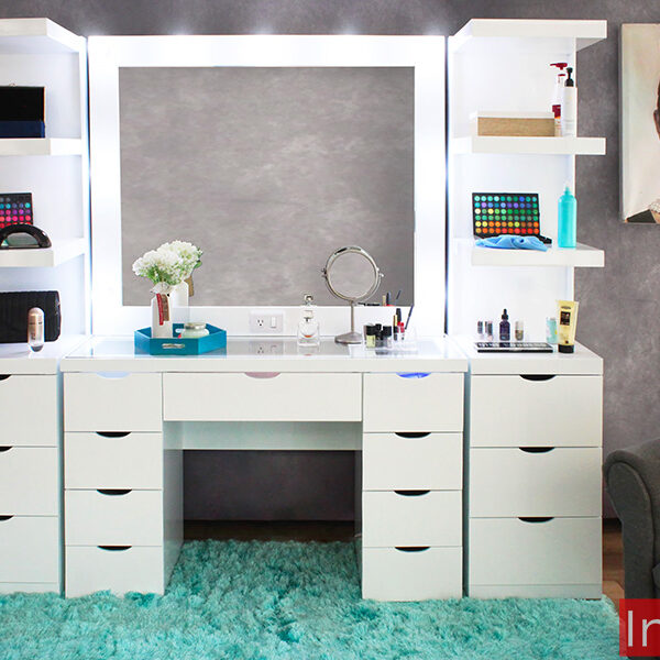 Son ideales para guardar maquillaje, perfumes, joyas y accesorios. Algunos modelos incluyen bancos cómodos e iluminación tipo camerino, añadiendo un toque de glamour y funcionalidad a tu